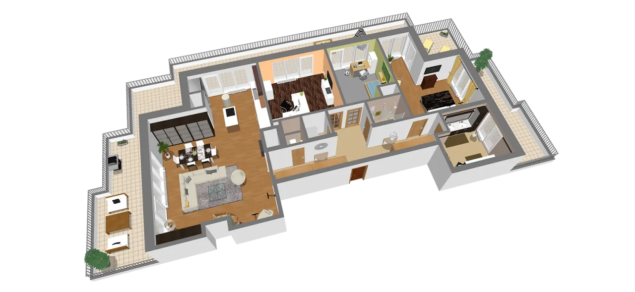 Ale tím nekončíme! Náš tým převádí 2D půdorys do úchvatného 3D modelu. Přidáme výšku stěn a další vertikální prvky, aby model odpovídal skutečnosti. Poté přidáváme detaily interiéru a exteriéru, včetně nábytku, dekorací, oken a dveří, aby váš projekt ožil.